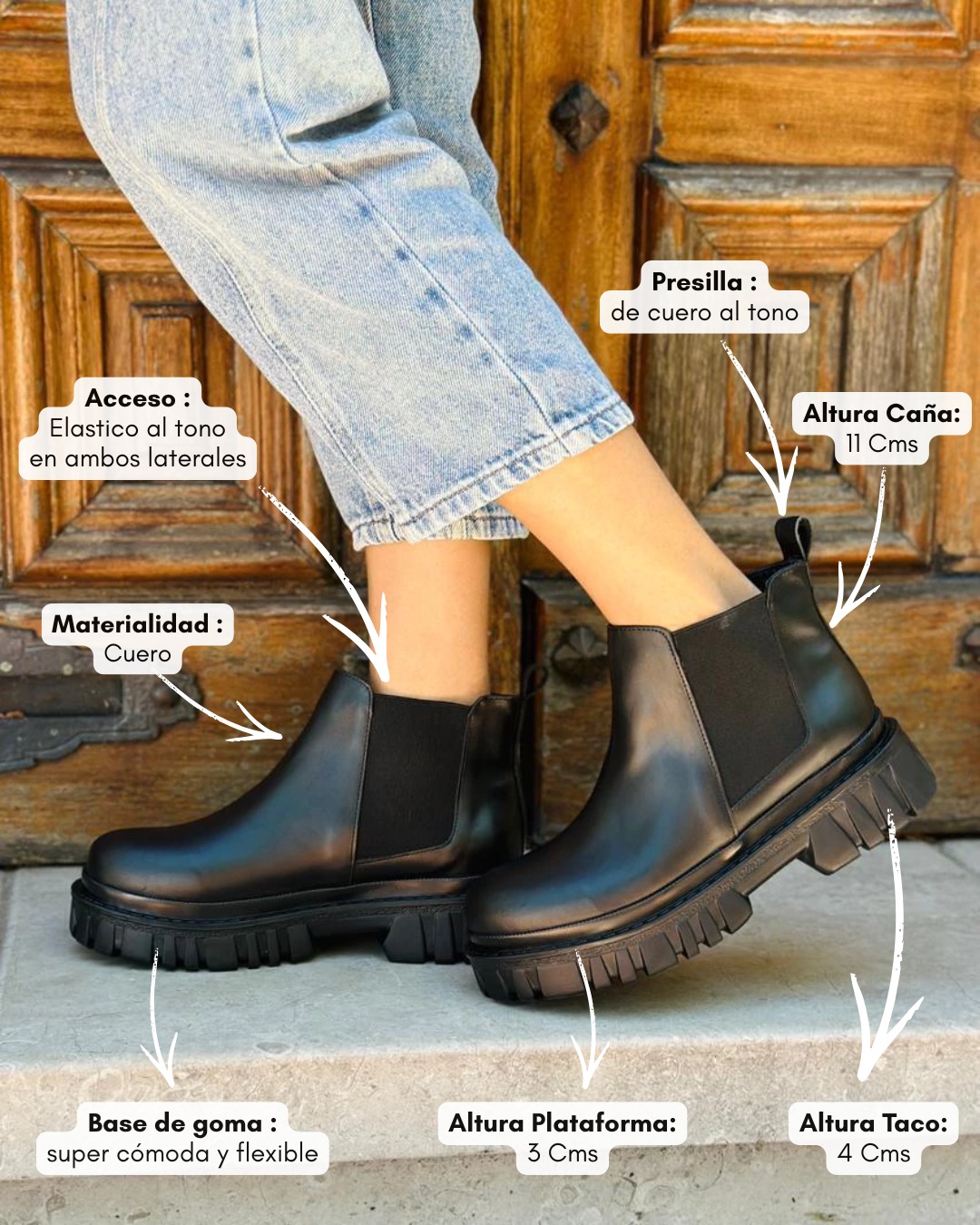 Su diseño se destaca por la puntera redondeada, los elásticos laterales tipo Chelsea que facilitan el calce y aseguran un ajuste práctico, y el tirador trasero que suma funcionalidad sin perder estilo.