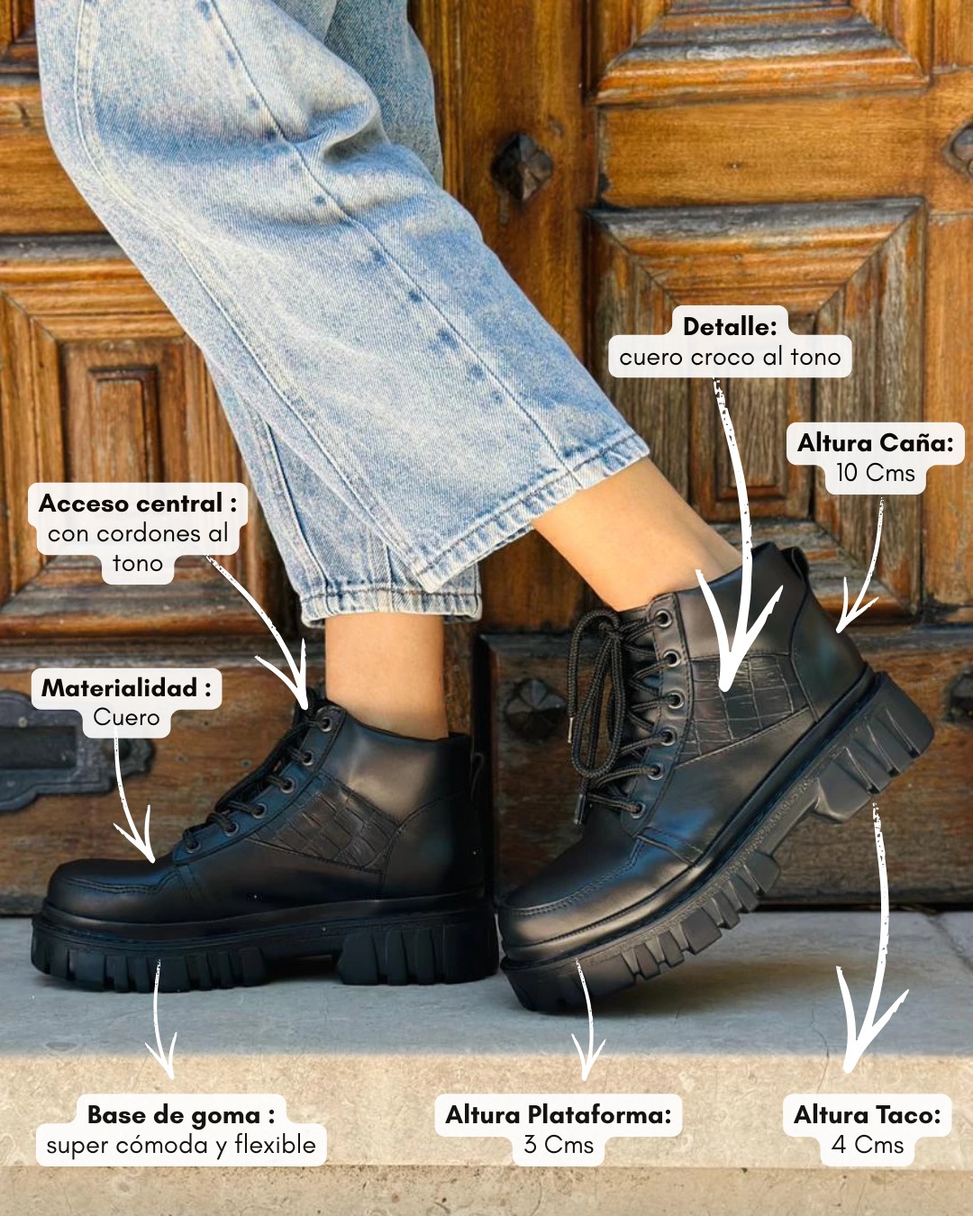 Confeccionado en cuero de excelente calidad, ofrece un calce firme y confortable que se adapta al pie desde el primer uso. Su estructura sólida brinda soporte y estabilidad, mientras que la suela chunky con base dentada asegura una pisada segura y cómoda en todo tipo de superficies.