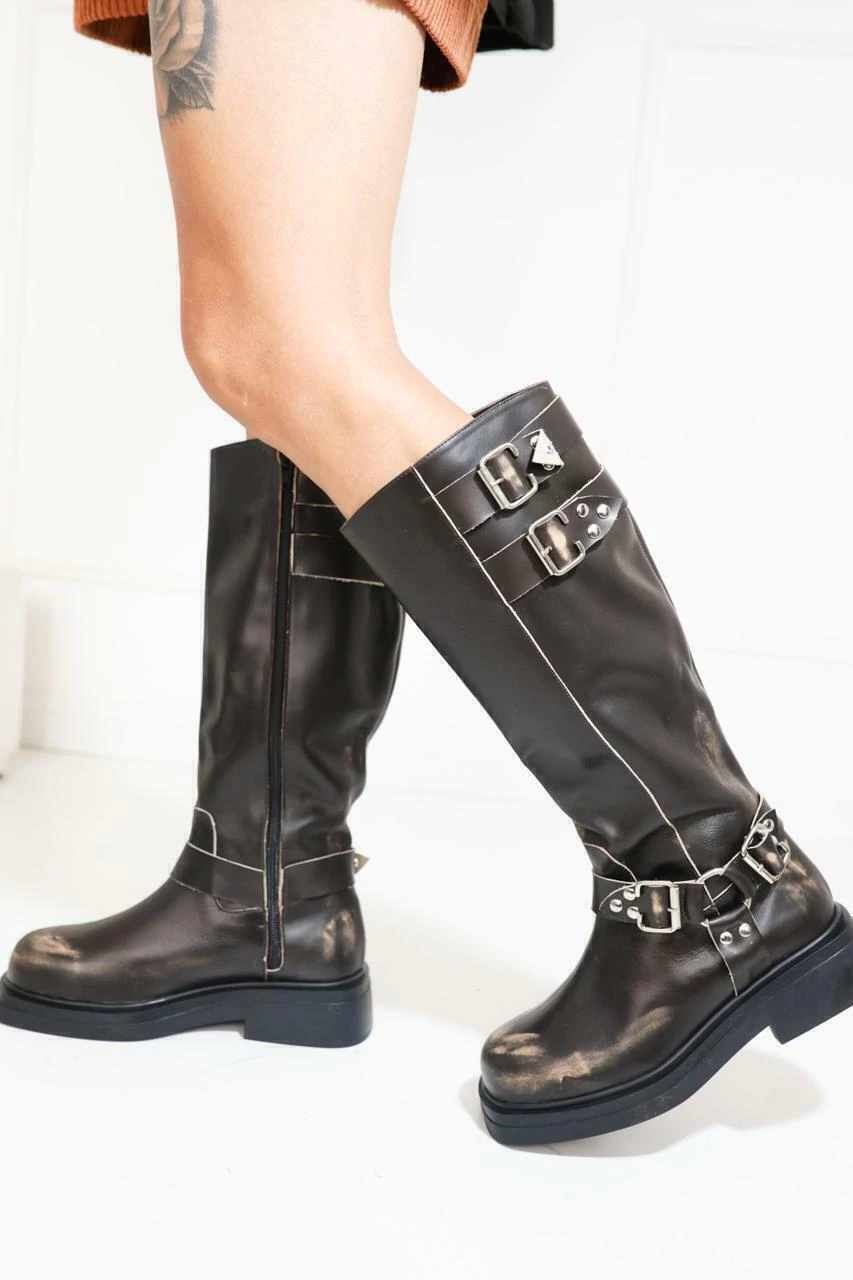 Descubre la Bota Aruba Chocolate, una pieza imprescindible para tu colección de calzado. Estas botas de caña alta estilo biker boots son la perfecta fusión de elegancia y audacia. El color tendencia chocolate es versátil, permitiéndote combinarlas con cualquier atuendo, y las hebillas metálicas en los laterales, junto con la pulsera en la parte inferior, añaden un toque atrevido y moderno al diseño.