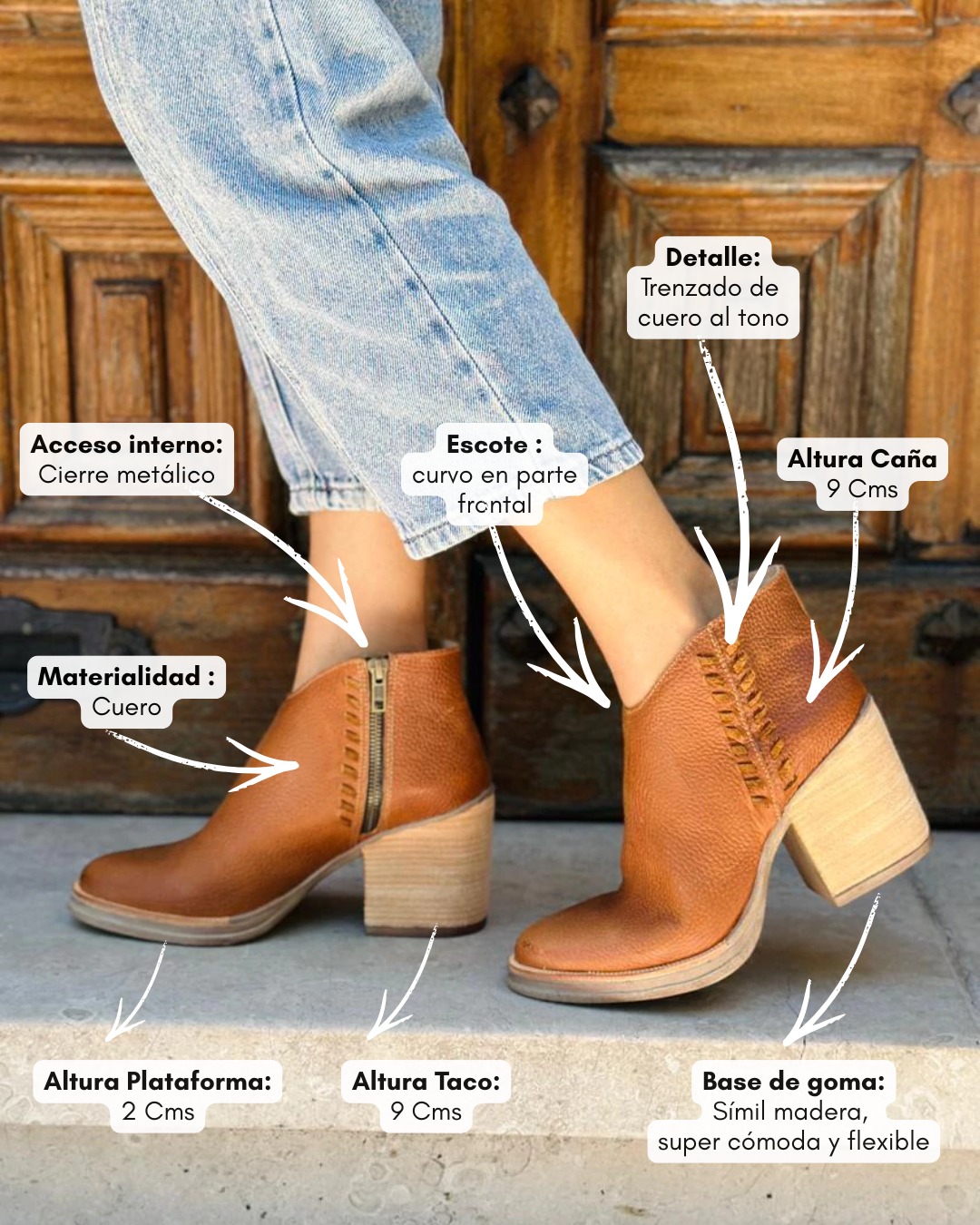 Su diseño se destaca por la puntera redondeada, las costuras artesanales laterales que aportan carácter y el cierre lateral que facilita el calce, logrando un equilibrio perfecto entre funcionalidad y estética.