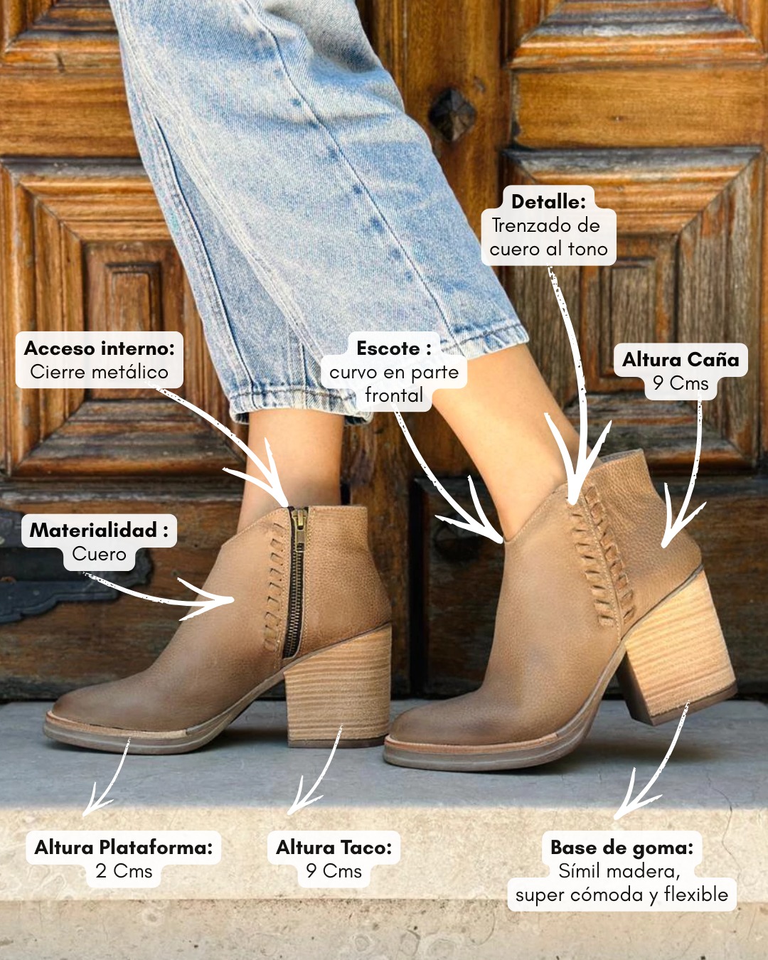 Su diseño incluye puntera redondeada, detalle de costuras artesanales que suman carácter y un cierre lateral que facilita el calce, asegurando practicidad sin perder estética.