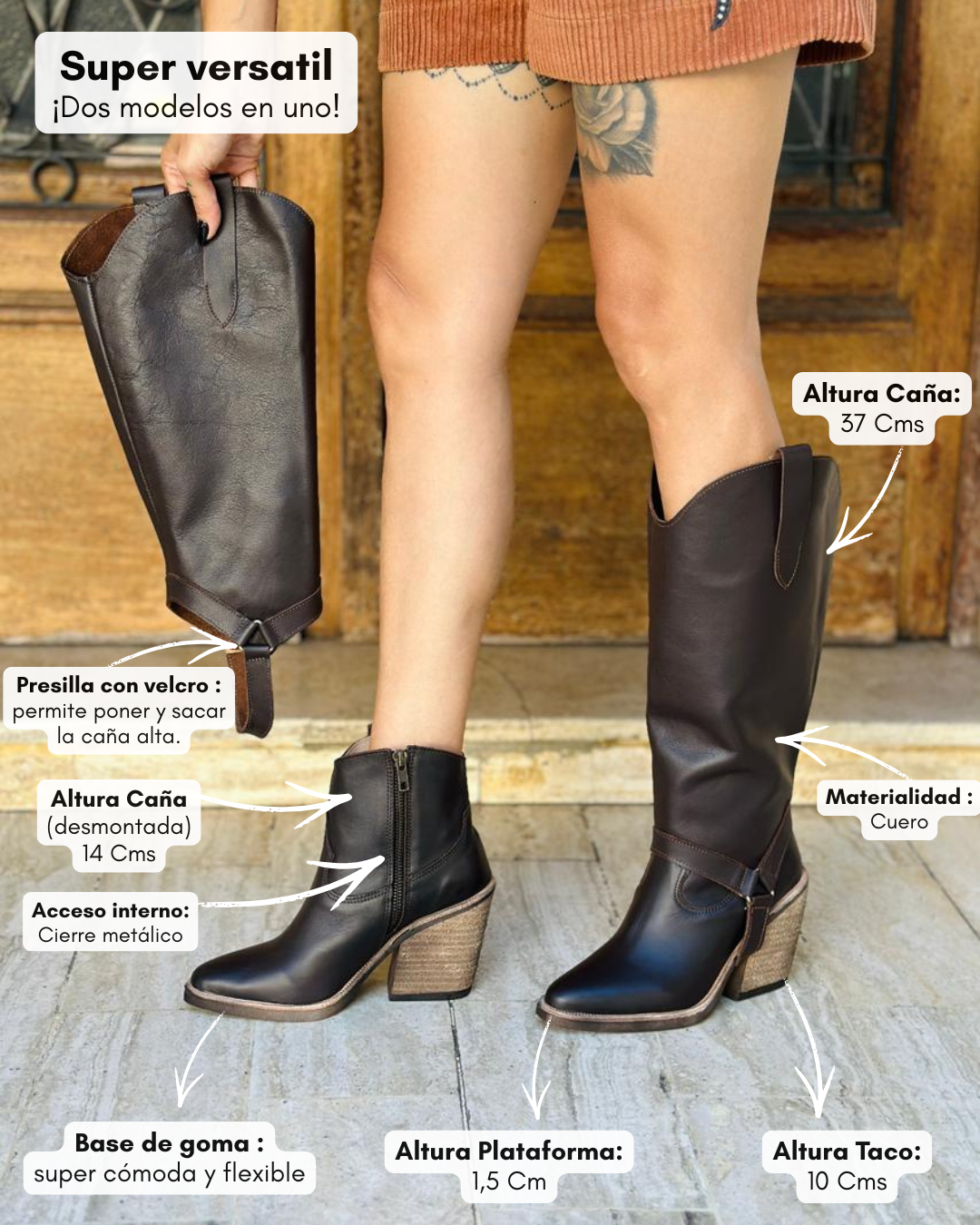 Confeccionada en cuero de alta calidad, su tono profundo realza el diseño de inspiración western y aporta sofisticación a cualquier look. Su diferencial está en la caña desmontable, que permite llevarla como bota alta o transformarla en botineta según la ocasión.