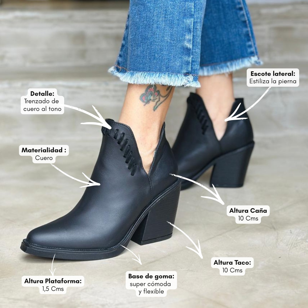 El taco ancho y alto estiliza la silueta brindando firmeza y comodidad para el uso diario. Su escote en V frontal alarga visualmente la pierna y le da un toque contemporáneo.