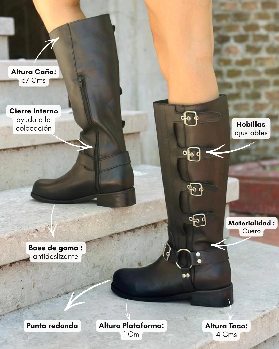 Confeccionada en cuero liso de alta calidad, se destaca por su caña alta con múltiples hebillas metálicas que aportan carácter, personalidad y un aire moderno. El cierre lateral interno permite un calce práctico y cómodo para el uso diario.
