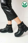 Fabricada en cuero de alta calidad, esta bota se distingue por sus dobles cierres laterales que facilitan el calce, y una pulsera con hebillas y tachas cruzadas alrededor, que añaden un toque moderno y rebelde.