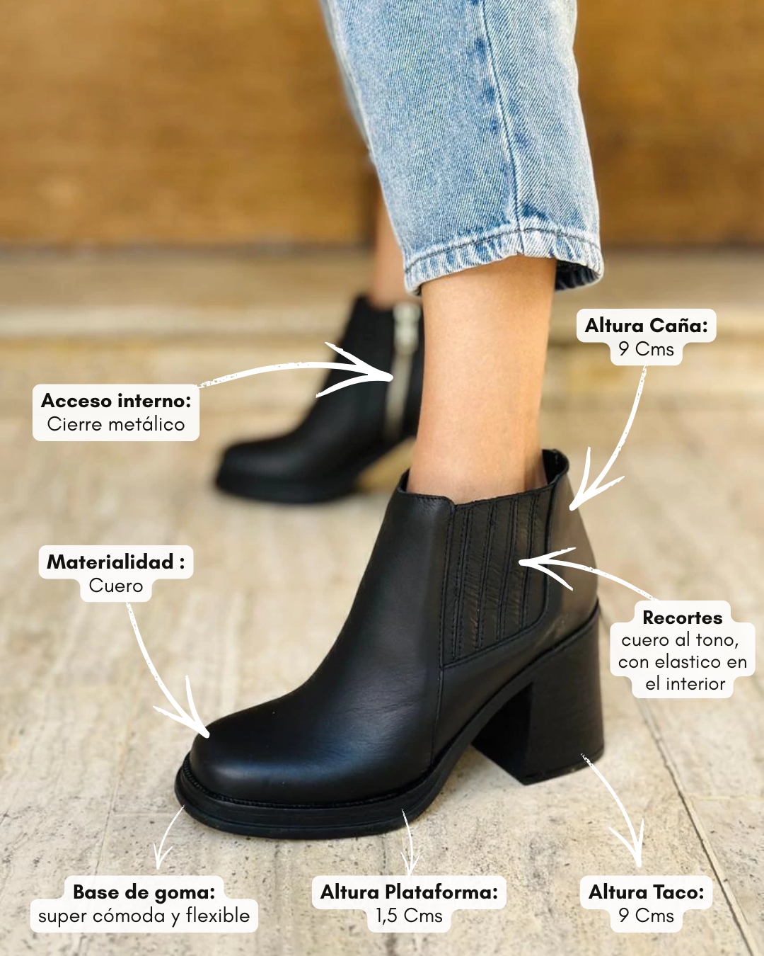 Confeccionada en cuero genuino, su diseño limpio y depurado resalta por su silueta estilizada y líneas suaves. El detalle lateral elastizado aporta comodidad y practicidad, además de un ajuste flexible que se adapta al movimiento.