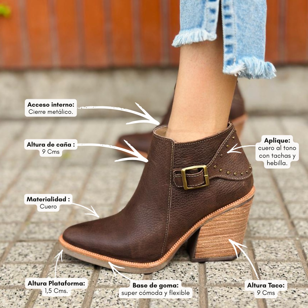 Confeccionada en cuero chocolate texturado, su diseño de caña baja se destaca por la hebilla lateral y las pequeñas tachas metálicas, que aportan un toque sutil de carácter sin perder elegancia.