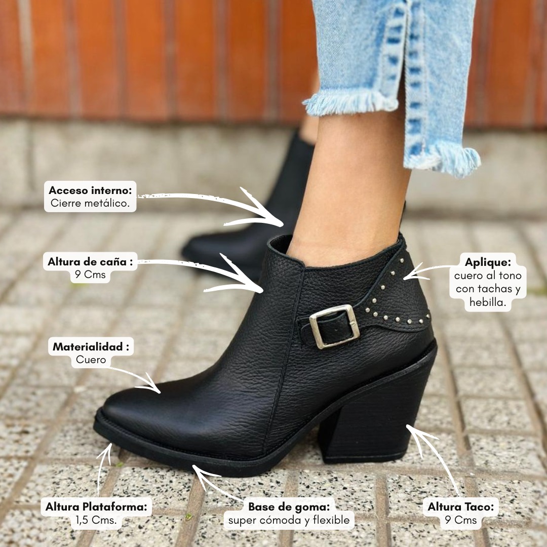 Confeccionada en cuero negro texturado, se destaca por su detalle de hebilla lateral y pequeñas tachas metálicas, que le aportan personalidad sin perder sofisticación.
