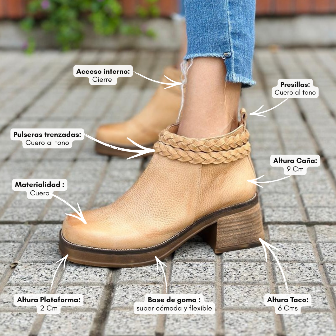 Confeccionada en cuero texturado, se destaca por su detalle de trenza alrededor de la caña que aporta un aire artesanal y distintivo. Su diseño limpio se equilibra con un taco medio ancho que brinda altura y estabilidad, logrando una silueta cómoda y versátil.