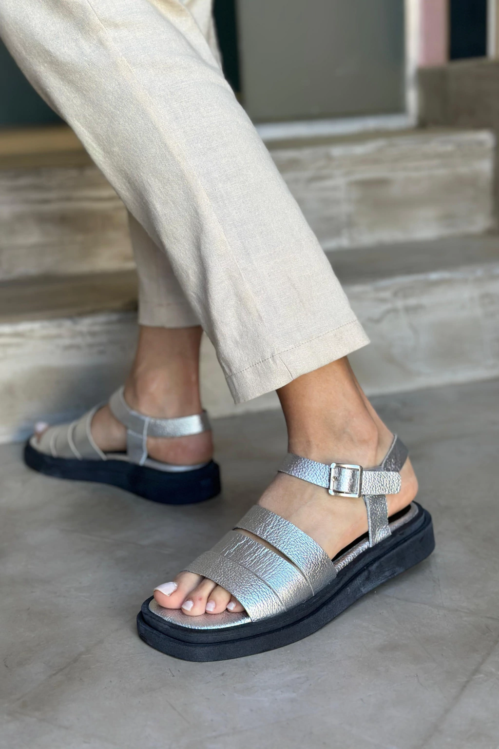La Sandalia Carla Plata es el complemento ideal para combinar con jeans, vestidos o faldas. Su acabado en tono metálico aporta un toque sofisticado y atemporal a tus looks, realzando cualquier outfit con personalidad.
