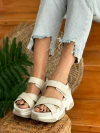 Su diseño incluye unA pulsera ancha en el tobillo con hebilla metálica, aportando ajuste, seguridad y un toque de distinción. La base baja incorpora un delicado detalle en madera, sumando versatilidad y un aire moderno que se adapta tanto a eventos casuales como formales.