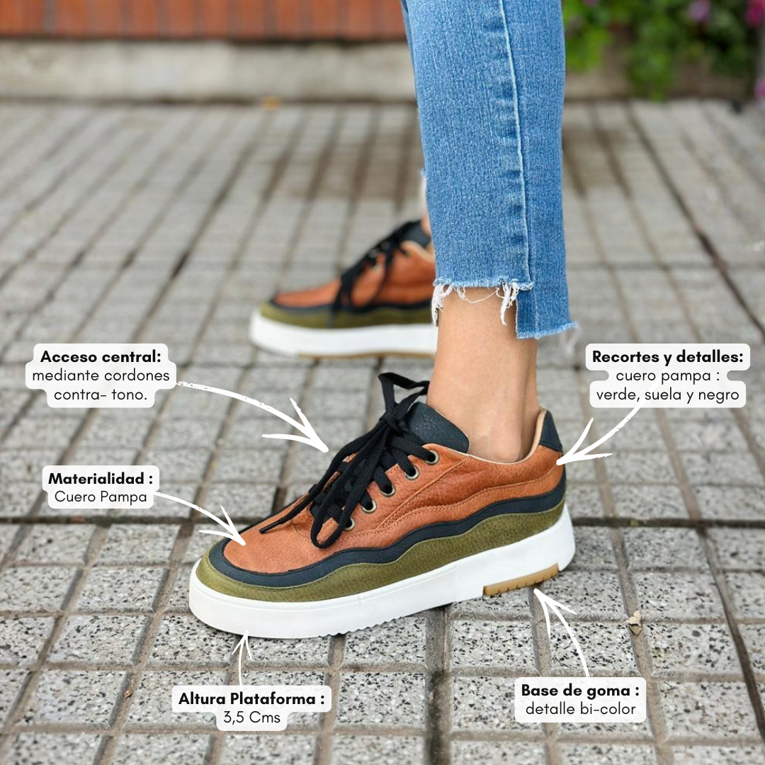 Confeccionada en combinación de materiales y tonos, se destaca por sus capas en verde, suela y negro que generan un contraste moderno y dinámico. Sus cordones negros y su base blanca aportan equilibrio, logrando un diseño versátil pero con mucha personalidad.