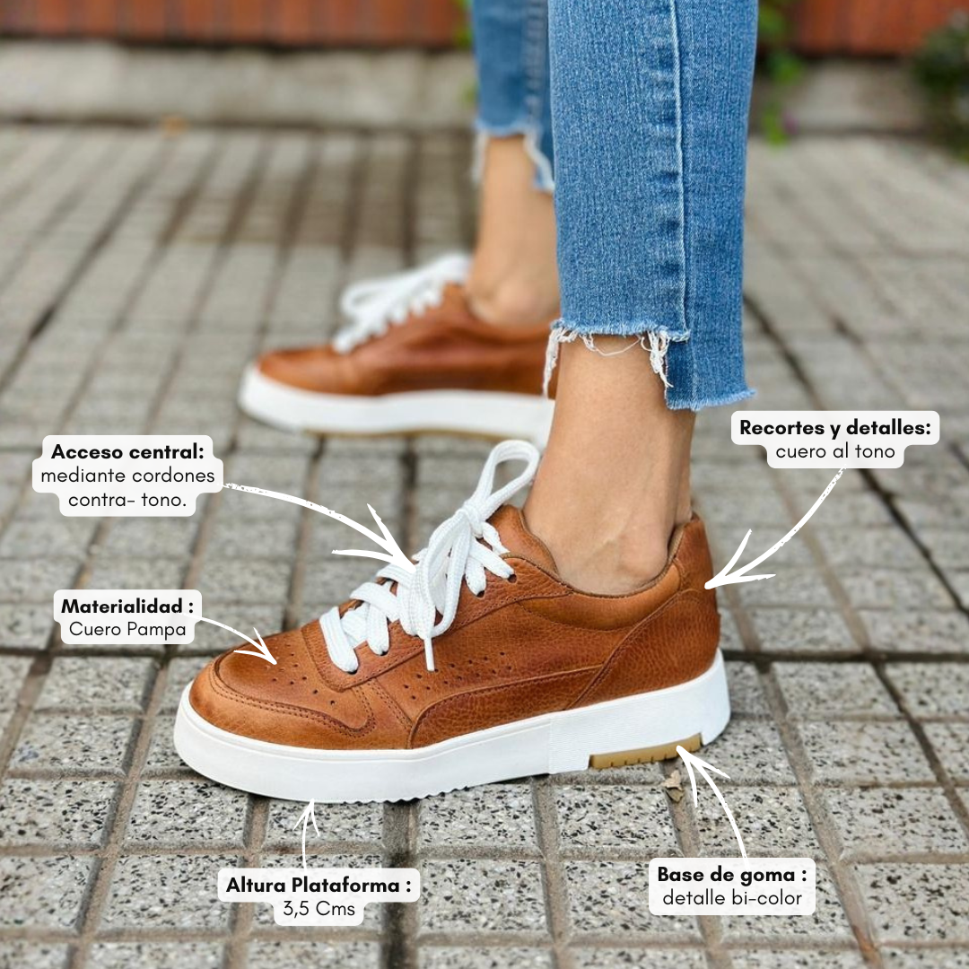 Confeccionada en cuero texturado, se destaca por su diseño clásico tipo sneaker con cordones y suela blanca contrastante, que le aporta un aire moderno y versátil. Su base liviana y cómoda la convierte en una opción perfecta para usar todo el día.